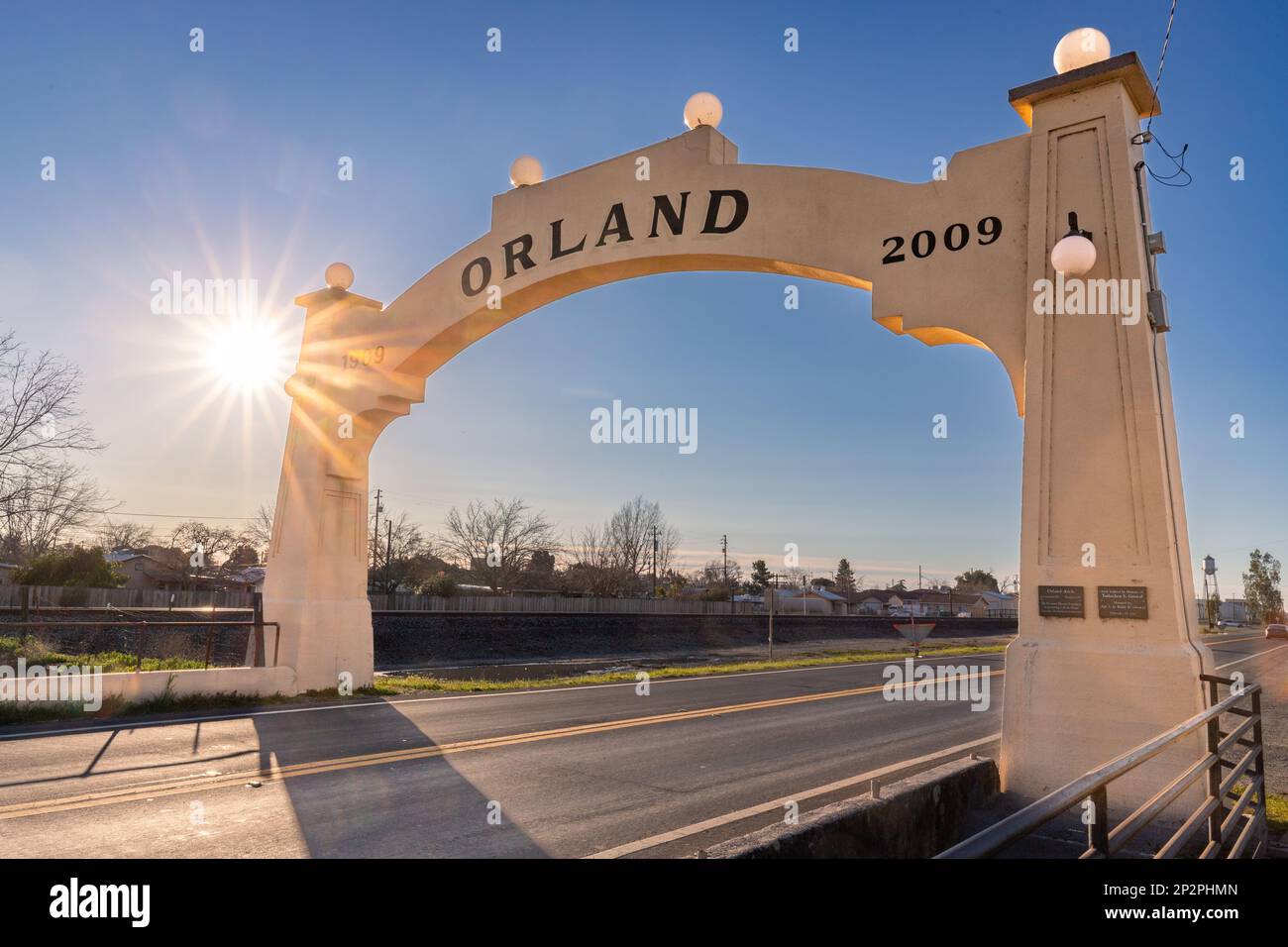 Orland CA USA Feb 12, 2023 Arch over highway as you enter town was